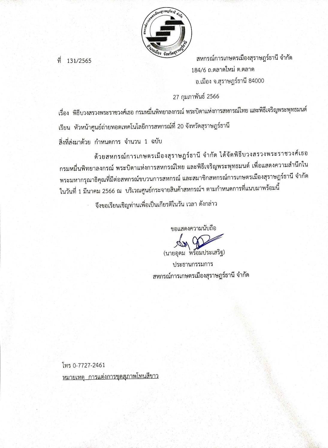 วันที่ 1 มีนาคม 2566 ด้วยสหกรณ์การเกษตรเมืองสุราษฎร์ธานี จำกัด ได้จัดพิธีบวงสรวงพระราชวงศ์เธอ กรมหมื่นพิทยาลงกรณ์ พระบิดาแห่งการสหกรณ์ไทย และพิธีเจริญพระพุทธมนต์ เพื่อแสดงความสำนึกในพระมหากรุณาธิคุณที่มีต่อสหกรณ์ขบวนการสหกรณ์ และสมาชิกสหกรณ์การเกษตรเมืองสุราษฎร์ธานี จำกัด นายวิชวุทย์ จินโต ผู้ว่าราชการจังหวัดสุราษฎร์ธานีเป็นประธานในพิธีพร้อมด้วยสำนักงานสหกรณ์จังหวัดสุราษฎร์ธานีและนายเจษฎา ขวัญแก้ว ผู้อำนวยการศูนย์ถ่ายทอดเทคโนโลยีการสหกรณ์ที่ 20จังหวัดสุราษฎร์ธานี เข้าร่วมพิธีในครั้งนี้ ณ สหกรณ์การเกษตรเมืองสุราษฎร์ธานี ตำบลบางใบไม้ อำเภอเมือง จังหวัดสุราษฎร์ธานี
