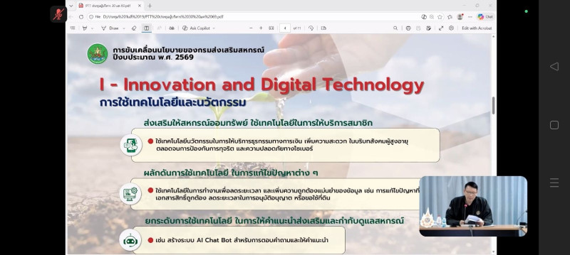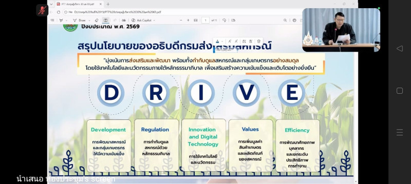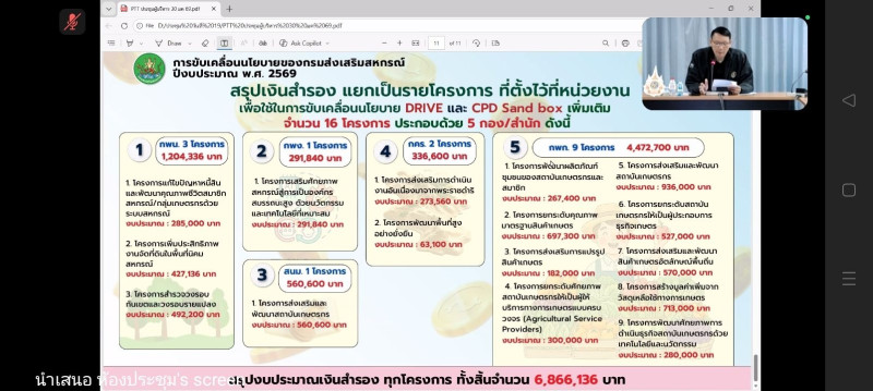 วันที่ 19 กุมภาพันธ์ 2569 นางสาววิลาวัลย์ แก้วเกาะสะบ้า ผู้อำนวยการศูนย์ถ่ายทอดเทคโนโลยีการสหกรณ์ที่ 20 จังหวัดสุราษฎร์ธานี พร้อมด้วยบุคลากรของศูนย์ฯ เข้าร่วมประชุม “การขับเคลื่อนนโยบายของกรมส่งเสริมสหกรณ์ ปีงบประมาณ พ.ศ. 2569 (CPD DRIVE และ CPD Sandbox)” ผ่านระบบออนไลน์ Zoom Meeting ส่งสัญญาณจากห้องประชุม ฝ 101 อาคารฝึกอบรมส่วนกลาง สำนักพัฒนาและถ่ายทอดเทคโนโลยีการสหกรณ์